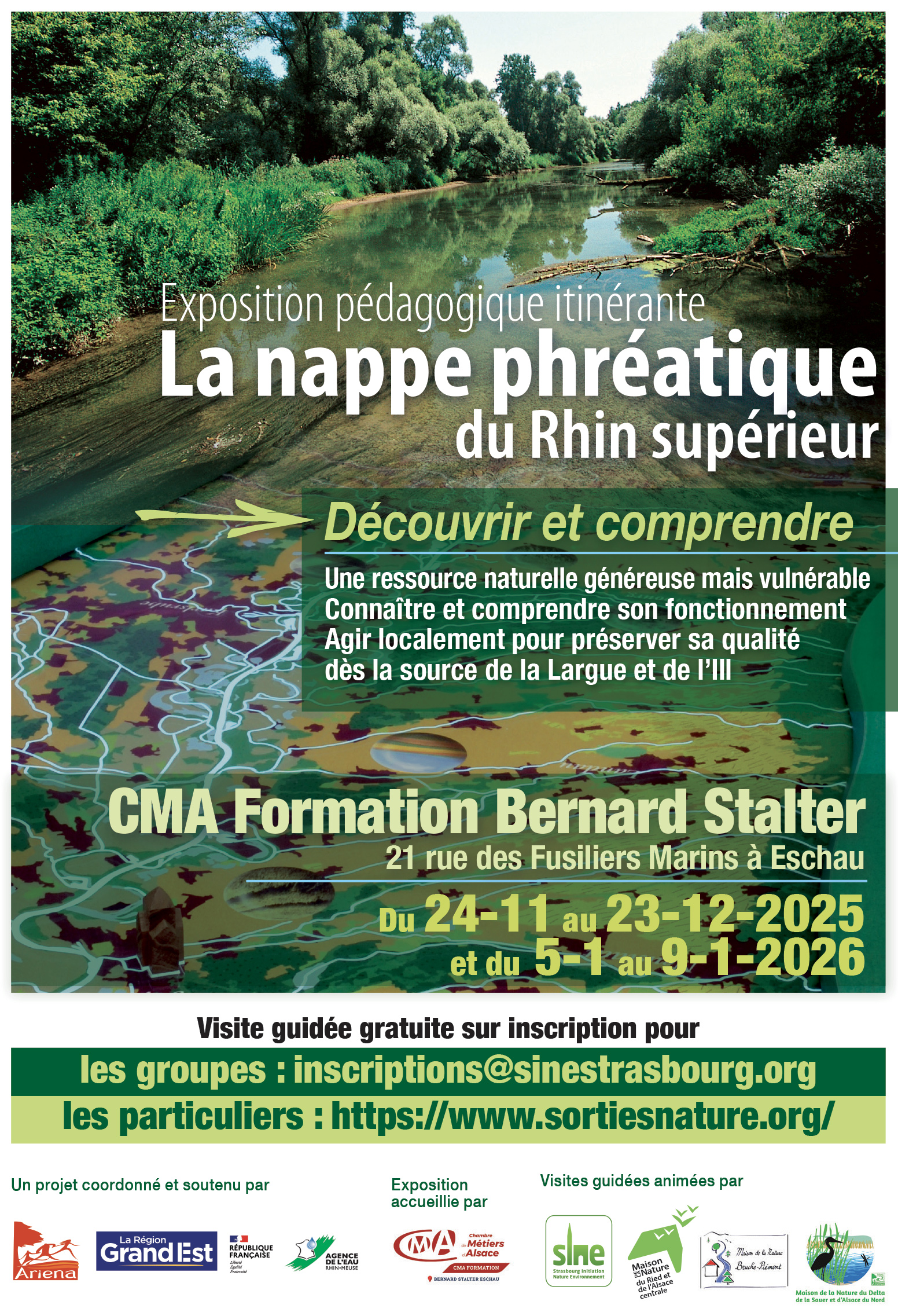 L’exposition « La nappe phréatique du Rhin supérieur » est le fruit d’un travail trinational dans le cadre d’un programme européen (Interreg III) sous l’égide de la Région Alsace et de la Landesanstalt für Umwelt, Messungen und Naturschutz Baden Württemberg, soutenu par l’Agence de l’eau Rhin-Meuse.