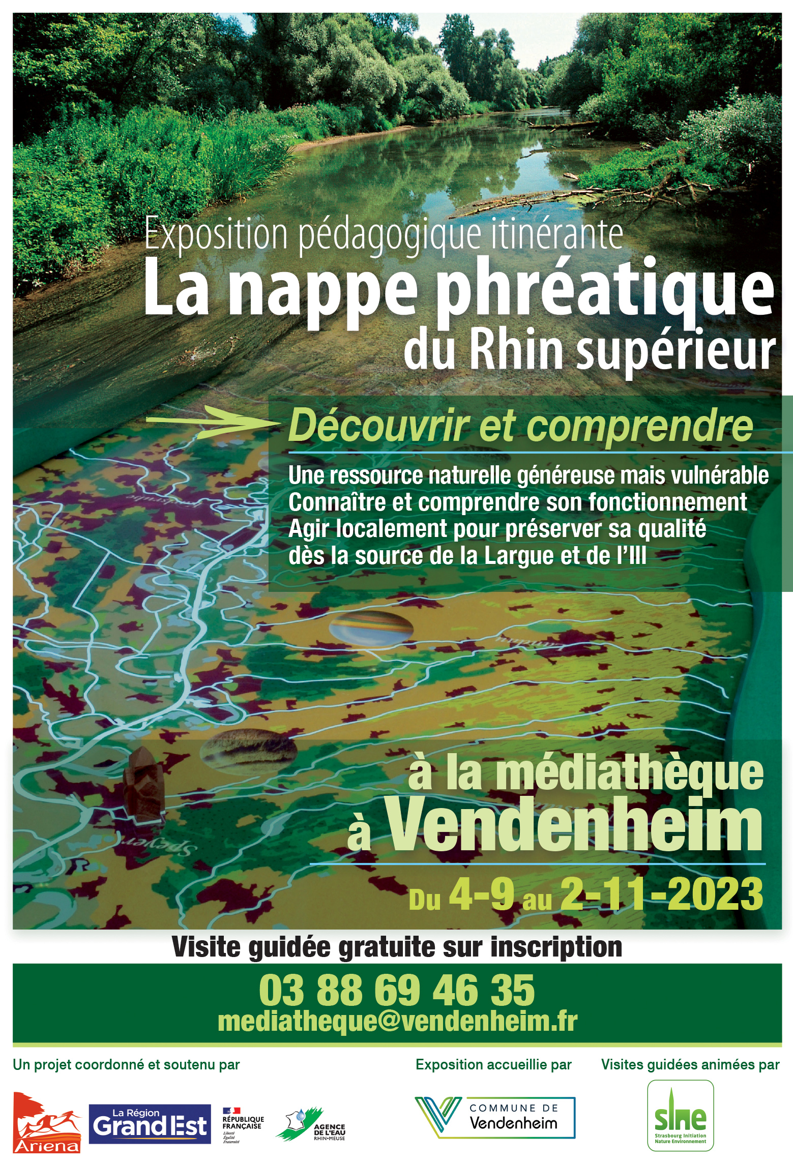 L’exposition « La nappe phréatique du Rhin supérieur » est le fruit d’un travail trinational dans le cadre d’un programme européen (Interreg III) sous l’égide de la Région Alsace et de la Landesanstalt für Umwelt, Messungen und Naturschutz Baden Württemberg, soutenu par l’Agence de l’eau Rhin-Meuse.